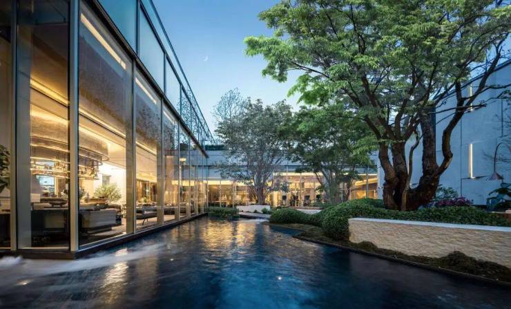 向外连接的是下沉庭院的“古树浮桥”,水镜、古树、桥廊与围合立面共同形成一个“可停留”的自然剧场——不是装饰,而是鼓励你去使用的第三空间。