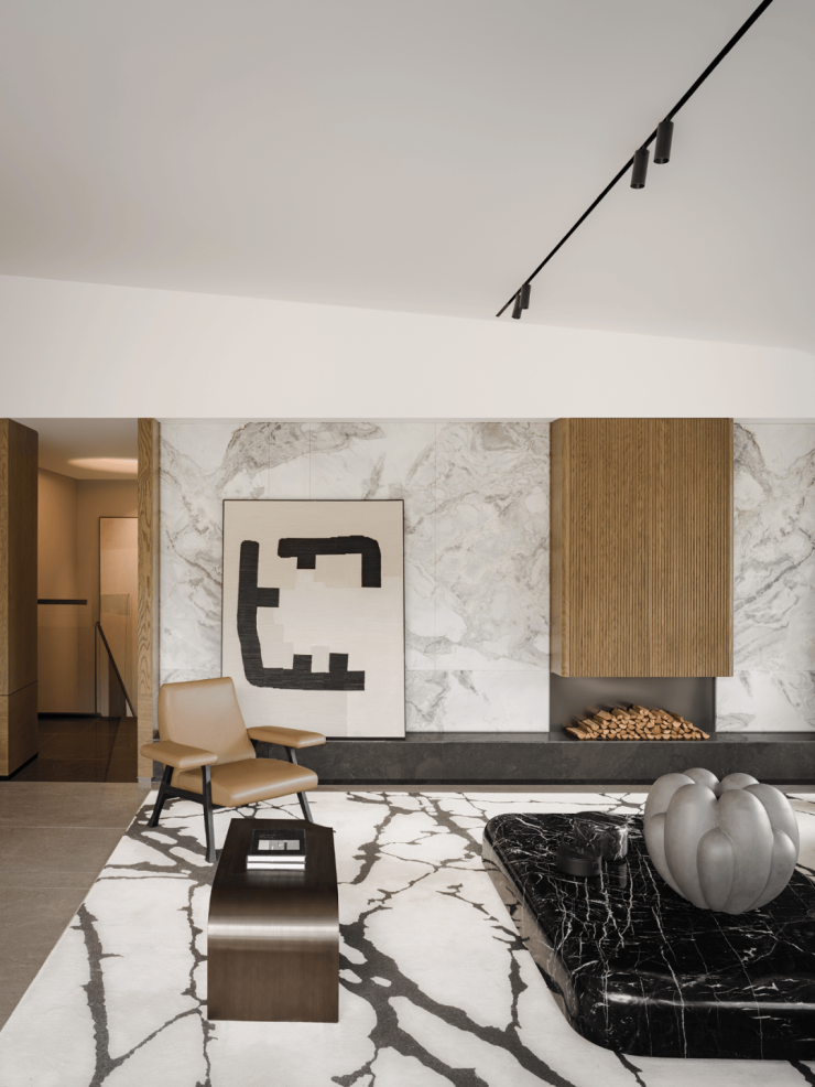 细密精致线条的木饰面与高贵石材结合奠定了经典纯粹的美感。所有休憩空间全部采用无主灯设计,柔和布光,且从公区到衣帽间,至卧榻一步步光影由明转暗,逐步带来放松的感受。