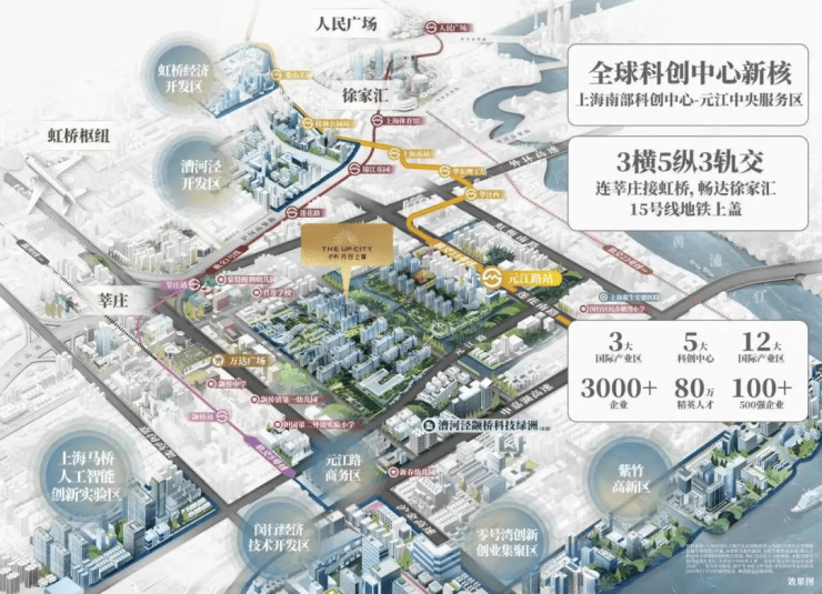 未来将以科创产业为动力,引入100多家五百强企业,吸纳80万全球高端人才,建设商业休闲、优质教育、文化体育、城市公园等综合公共配套设施,打造创新、人文、生态高度融合的中央服务区,引领未来都市理想生活,为闵行描绘一幅充满无限可能的蓝图。