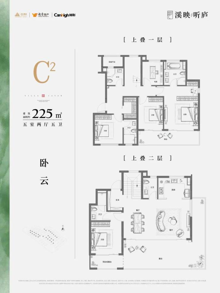 上叠主力户型建面约202-205-225方,全都是五房配置,基本总价在1000万以内。