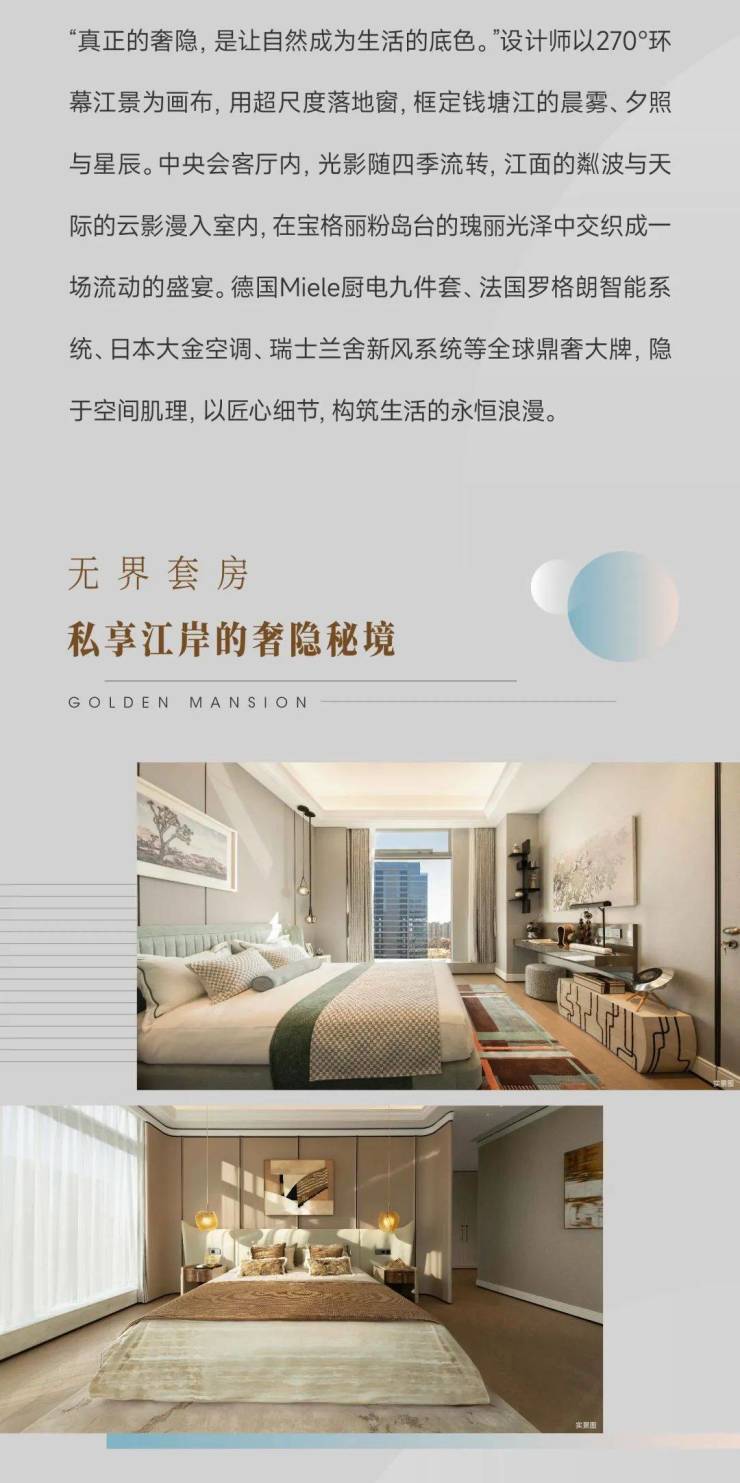 珍贵的土地,值得涵养高贵的生活。在建筑面积约460㎡[领潮]与建筑面积约410㎡[湾潮]样板中,大师设计精琢奢华的本象,在层高4米的朗阔场域中,打造270°巨幕观江视野,超大LDK家庭社交中心,为未来居者盛载流动且美好的生活情境。