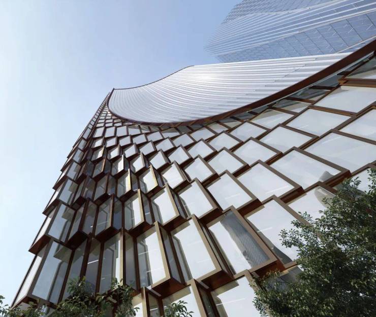 外立面是UNStudio做的龙鳞幕墙和杭州裙摆,来福士也是UN设计的,未来江两岸遥相辉映。杭州裙摆将大平层、安达仕酒店和自持超甲级写字楼连成一体,T1和T2通过高差,在裙摆下形成了围合住区,这种室内外交融的灰空间,是杭州绝无仅有的国际化体验。