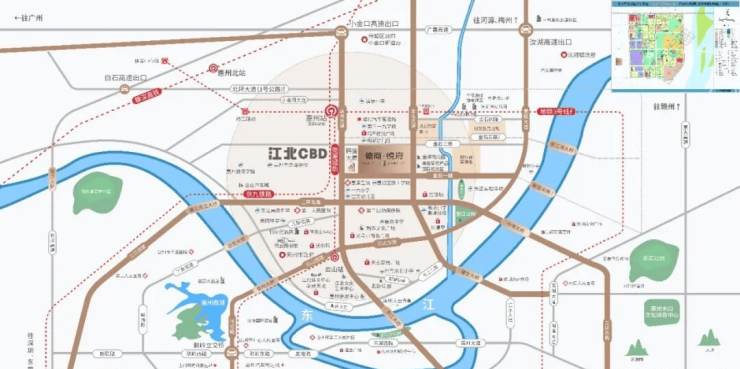 🌟江北CBD 惠州封面 顶级高配生活圈不是所有项目都享有天赋地脉,项目位于江北地段,而江北作为惠州的城市封面—CBD中心,承载着惠州市超90% 的市政配套和总部商务、甲级写字楼,承接深圳的高端技术人才、高新产业,直面深圳都市圈所带来的人口红利。项目享有江北CBD核心商业配套佳兆业广场(3km)、华贸天地(5km)、荣灿中心、中海广场(建设中),畅享中芯繁华生活。目前项目旁已在建设一个由商业步行街+写字楼+高端公寓组成的双子塔城市综合体,高150米,名为“腾盛大厦”,将打造成惠州市主城区新地标。