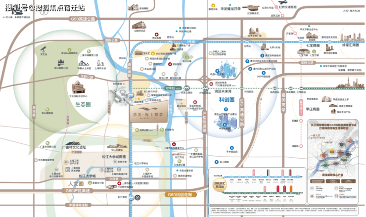 华发股份首次进驻松江,带着全新的“优+产品体系 5.0”,给洞泾、甚至给松江带来了当前区域内综合品质颇高的作品。依据上海生态环境保护“十四五”规划,立足于国际领先的可持续项目规划,华发·海上都荟结合其自身独有的聚合优势,在传统 TOD 规划的基础上,增添了无法复制的土地生态资源,向东与 G60 科创走廊中以镇命名的区块——洞泾人工智能产业基地相连接;向南能够直通亚洲的大学城之一——松江大学城;北侧紧靠上海陆面的自然山林资源——佘山国家旅游度假区。板块紧密贴合上海 2035 以及松江 2035 发展的关键节点,将该区域塑造为“科创+文教+生态”交汇的核心新城模式,创建出一个全新的城市单元范例。