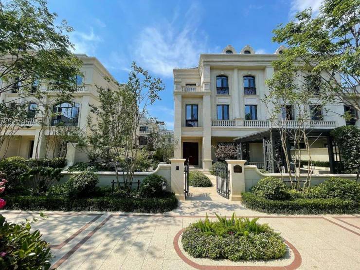 绿城法式经典 纯甄石材立面 沿承绿城经典法式联排风格,外立面石材干挂为主 私家车库直通地下室入户 ,法式大宅,代表了绿城造墅的至上修为。