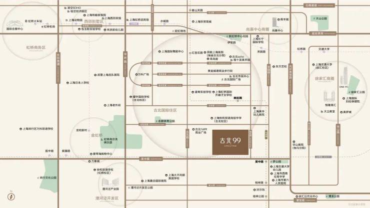 古北板块的价值不可估量!项目周边三轨环伺:距离15号线姚虹路站/吴中路站都在700米左右;地铁10号线宋园路站步行约1.3公里;规划在建的地铁25号线古北路站步行则约600米。自驾方面,周边主干道纵横,项目直线距离约1.4公里内到中环高架路、内环高架路、宜山路;直线距离约2公里到延安高架路。