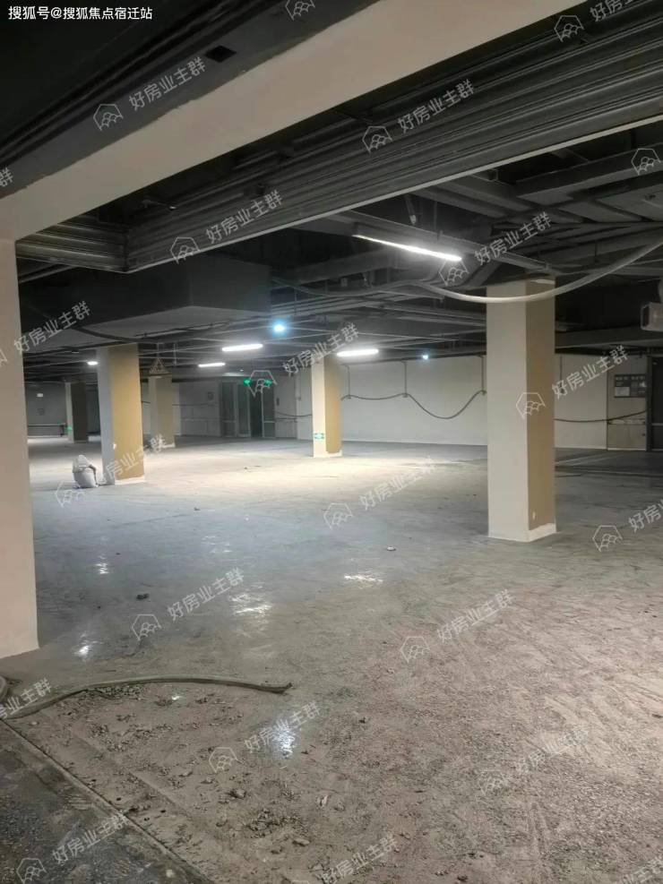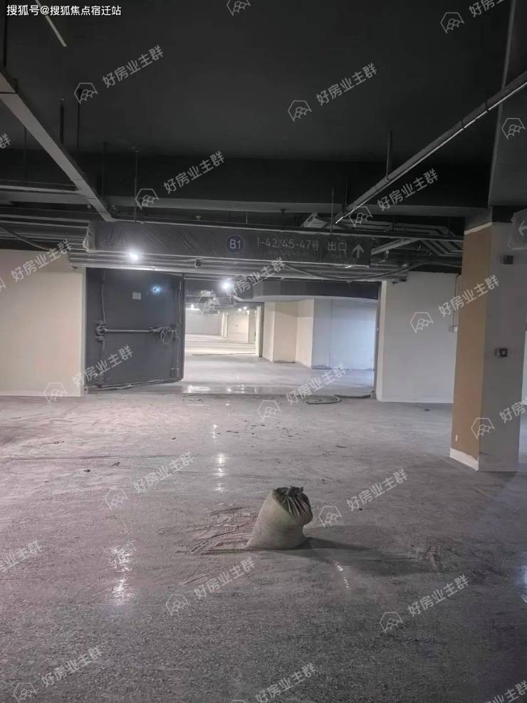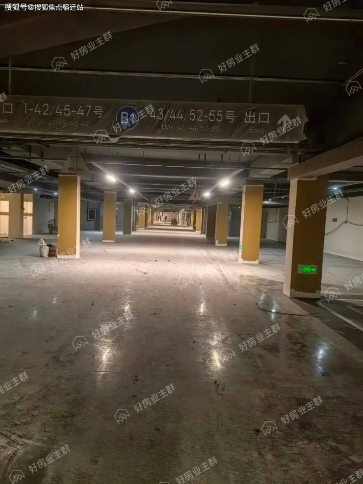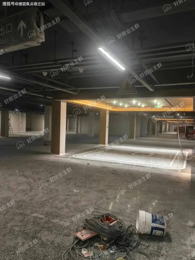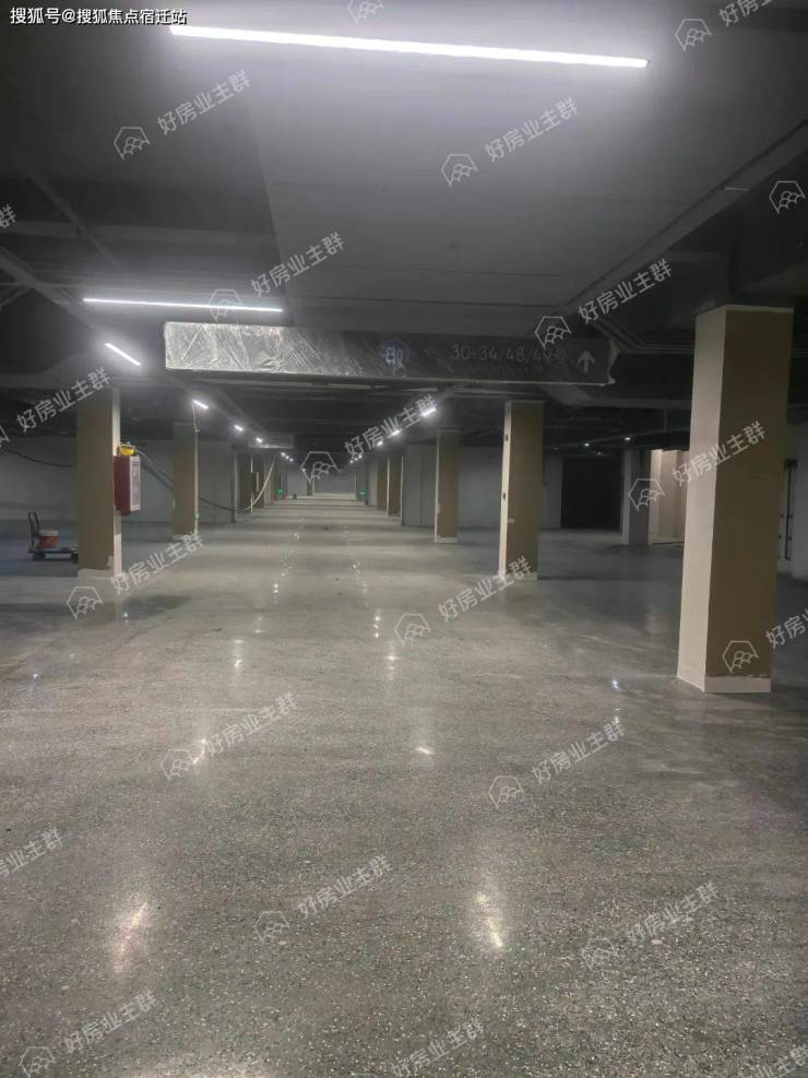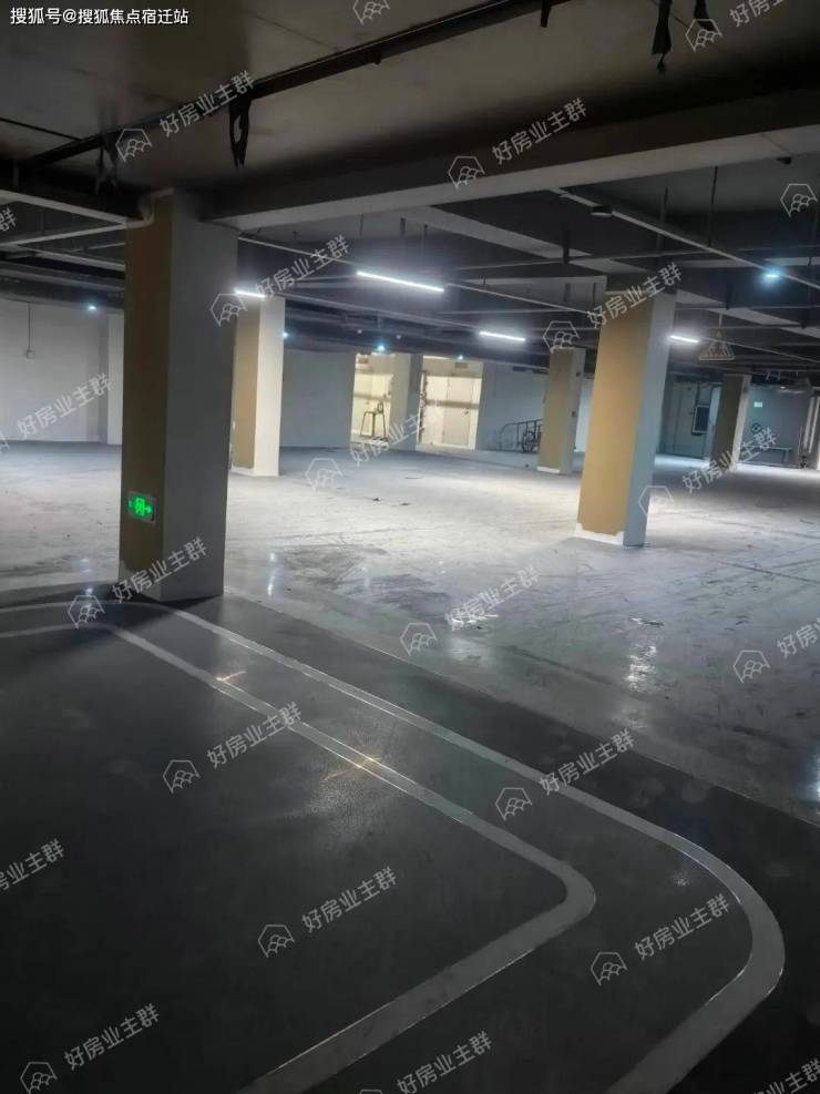 地下车库内部,地面环氧地坪漆施工已经完成,墙面已多次批白,墙面标识已粉刷施工完毕,车位已完成划分,行车车道方向指引喷漆还未完成;