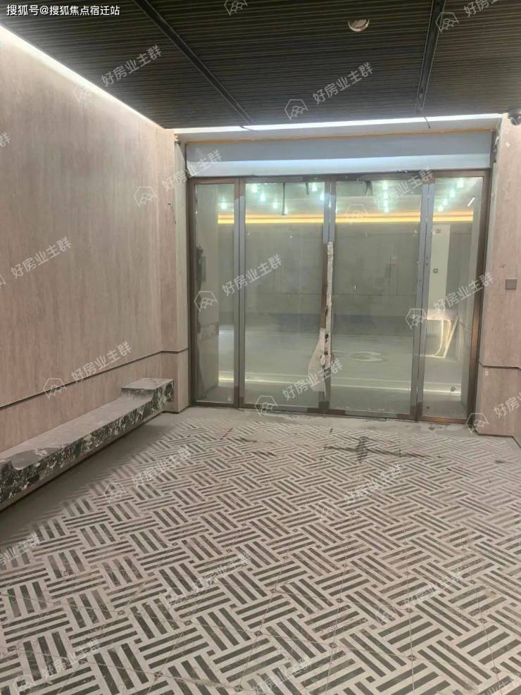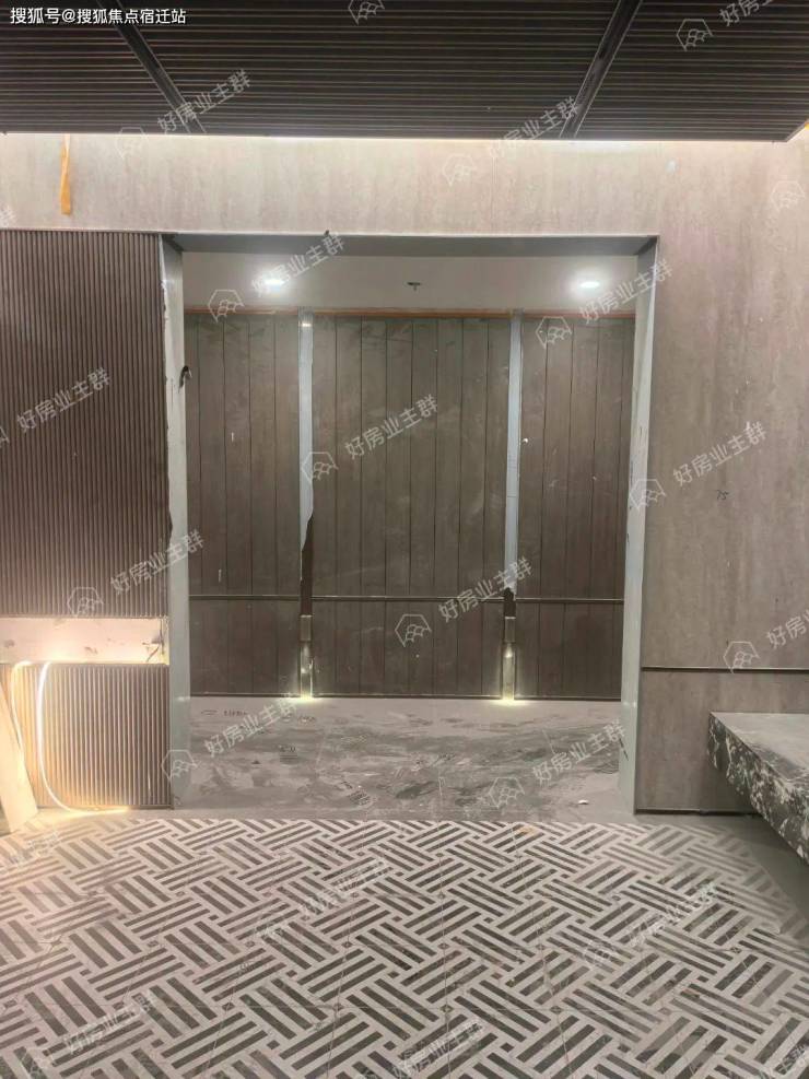 地下入户大堂基本已经装修完毕,墙面装饰有木格栅,地面铺设了几何图案地砖,目前现场保洁工作还未进行。