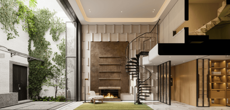 以王蒙《夏山高隐图》为灵感,借景临平山,创作超9米垂直山水庭院,境呈“重山叠翠 林泉高致”的立体山水,让归家成为一场高山流水的精神洗礼,重构当代士大夫心中的山水隐逸之境。