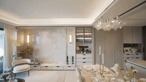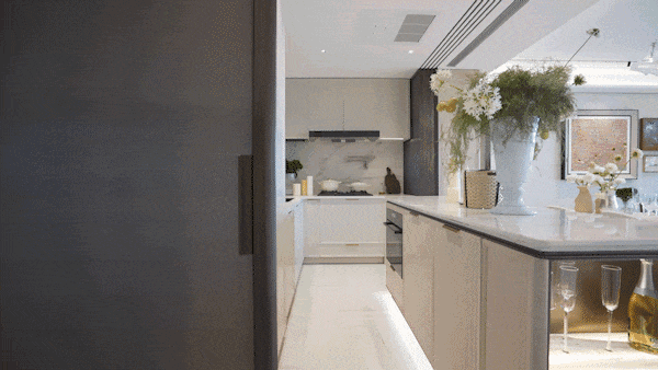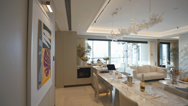 另外,因为豪宅客户对于精装美学有自己的审美,所以此次项目提供了超越行业的三大柔性定制——艺术家联名定制入户门把手、艺术家联名定制艺术门牌挂画以及墙面饰面&岛台等区域提供多款石材/岩板款式。