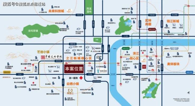 项目坐落于杭州市西湖区之江新城核心板块,毗邻富阳银湖开发区,紧邻杭州绕城高速西线转塘枢纽。地块北侧与中国美术学院、浙江音乐学院等高等艺术学府接壤,所处区域为政府重点规划的国家级文旅发展示范区,兼具钱塘江景观资源与西湖风景名胜区双重生态优势。