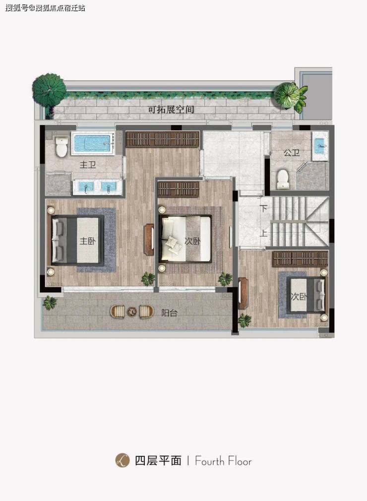 下叠四房两厅三卫的设计。一层南向整体面宽约10.8米,餐客厅一体,连通约7.2米的长阳台,大横厅与落地窗的搭配,增加了室内空间与庭院的互动。