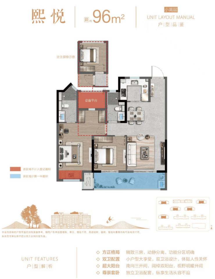 熙悦96 平米小高层户型,三房布局精巧,功能齐全。阳光充沛的客厅,宽敞明亮,是家人欢聚、共享欢乐的温馨之地。舒适的卧室,宁静而私密,为您提供优质的睡眠环境。双卫浴设计,小户型大享受,体贴人性关怀。