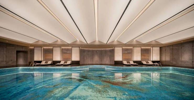 外立面采用四面铝板+巨幅玻璃窗墙的组合,主入口设计极具仪式感,约60米宽的门庭、百年罗汉松、融合良渚玉琮与西湖水韵的纹样。园林设计撷取南宋《四景山水图》意境,营造“一轴八境”;其核心亮点是约1500㎡的下沉式主题会所,内部配置了恒温泳池、健身房、SPA、私宴厅及茶室等,直面下沉庭院景观,将高端酒店式的生活方式引入社区。