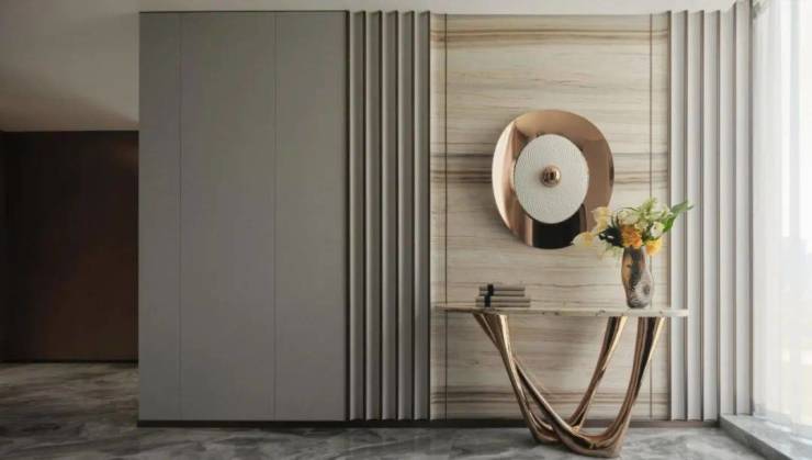 白色的岩板与桃木背景墙让人联想到枫丹白露宫殿的动人秋天。打造生活中的高级感不需要繁琐复杂的浮夸装饰,而是要在空间之内做减法。深色与浅色的交叠呼应之间,让曲线与直线共同构建空间的秩序,匹配房间整体弧形外观,打造内部张弛有度、流畅自如的线条感。