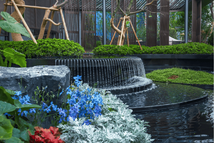 廊架下方,一处半围合的会客空间若隐若现,后期在这里或品茗、或插花、或对弈、或社交......一厅、一水、意境深远,整体的空间氛围大气且优雅。会客厅前方是近350㎡的中央阳光草坪的云上空间,为业主提供多功能户外活动场地,聚引生活的引力,绽放社区的活力。