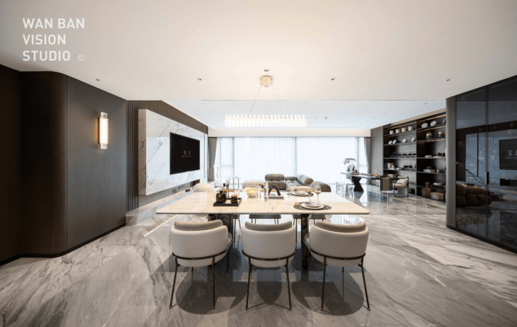 客厅背景墙更像是一场世界顶级石材展览,西边套用的是巴西进口石材天宝石,高贵中带着优雅;东边套用的是意大利卡拉拉大理石中的顶级「雕刻白」系列,我们熟知的世界著名雕塑《大卫》雕塑、世界著名建筑比萨斜塔等等,用的就是这一种石材。