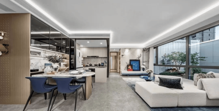 方厅奢阔:约32㎡客餐厅一体化空间,搭配LDK餐厨布局,U型厨房动线流畅,家庭互动更紧密。参照以下海沧中心TOD98平同款户型样板房照片,这样的空间设计会有一种进入150㎡+房子的错觉。