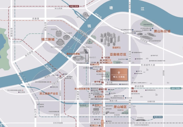 顺发•美颂城项目位于钱江世纪城东南翼,在奥体/钱江世纪城板块、亚运村板块、萧山科技城板块三大辐射圈内。由于地理位置上的优势,我们的交通网络十分完善。高架有“通惠快速路、机场城市大道”黄金十字轴,在轨道交通方面:项目距离地铁7号线耕文路站直线距离约1.1公里;距离地铁2号线振宁路站直线距离约1.8公里。地铁双线覆盖,快速畅达全城。