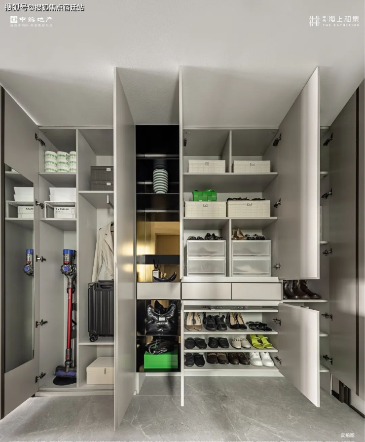 项目规划设计了诸多收纳空间,包括入户玄关、橱柜、电视柜、卫生间、阳台等等,总的来说中海海上和集的收纳设计真的非常用心!
