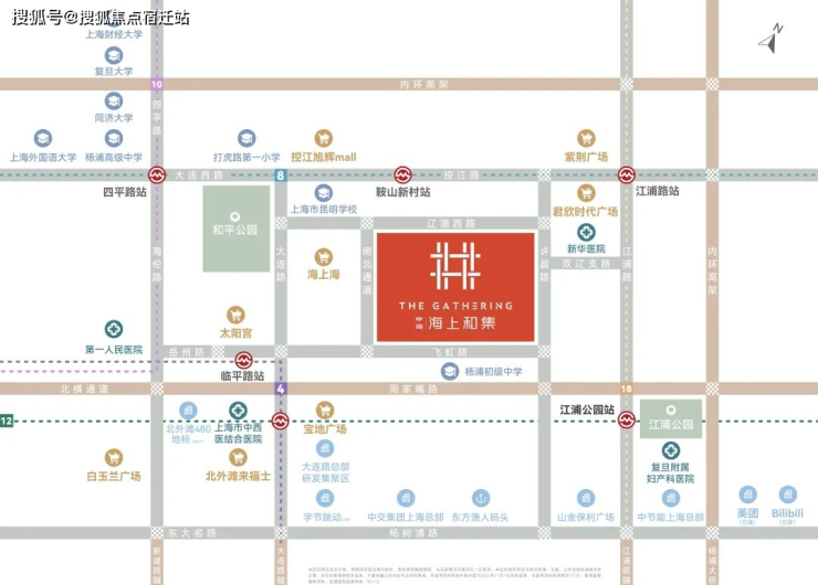 周边直线1.5-3公里可以到达北外滩来福士、白玉兰广场、瑞虹天地太阳宫、月亮湾、星星堂(数据来源高德地图)。