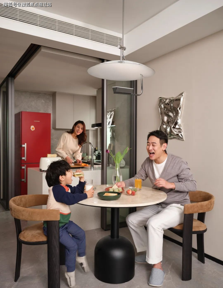 开放式厨房一般来说只有在150㎡以上的大户型才能看到,这样做先不提其中的成本,光是未来让整体空间拥有更好的交互感的设计用心,就已经诚意十足。