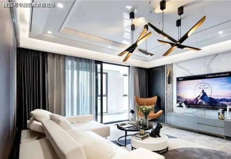 宽敞明亮的客厅:无主灯吊顶结合白色家具,上下呼应。深色背景墙注入摩登氛围,独特造型的吊灯彰显个性,窗边橙色休闲椅曲线流畅舒适,棕色木质背景墙与线条点缀体现精致生活态度
