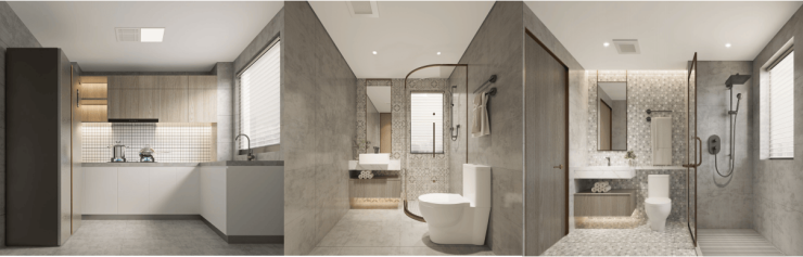 卫生间:灰白高级色调,科勒(台盆、水龙头、马桶、淋浴花洒)、奥普暖风机、摩恩(衣钩、毛巾环)等