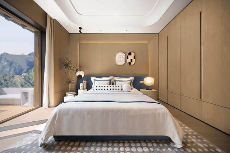 从家庭公区到卧室,几乎全部是落地门窗,青绿远山与自家院落皆入画,景致从绵软的枕畔,一路延伸到沙发和餐桌。