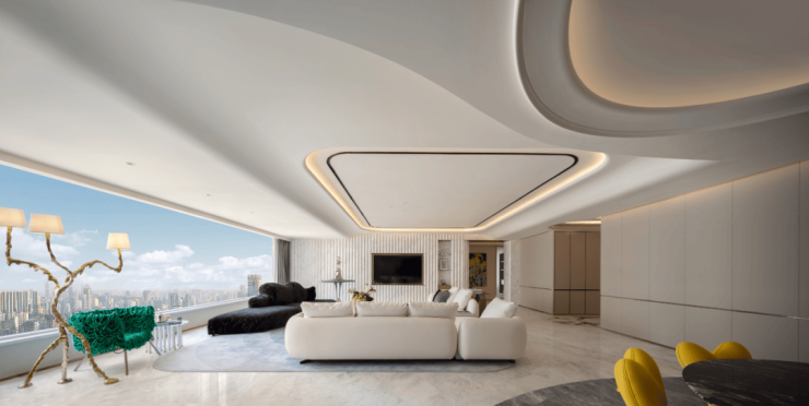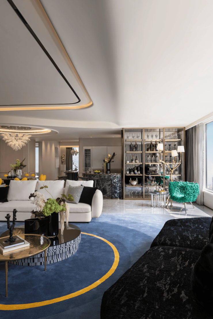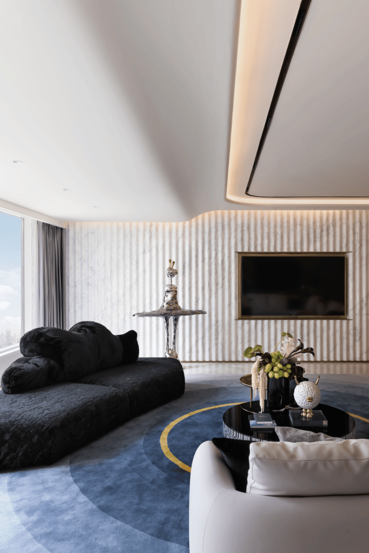 客厅背景墙融入水波流动般的曲面造型,转角处的圆弧处理,室内材质的对比呈现,大理石材的多样纹理、艺术家具的色彩碰撞,运用梦幻、艺术、时尚元素,共同延续新装饰主义NEO ART DECO精神。