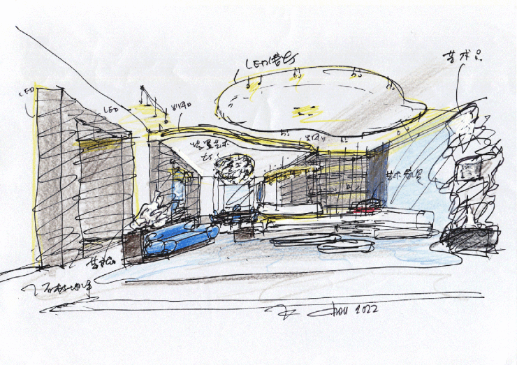 整体空间概念草图,经艺术化处理的空间形态与艺术品互为映衬