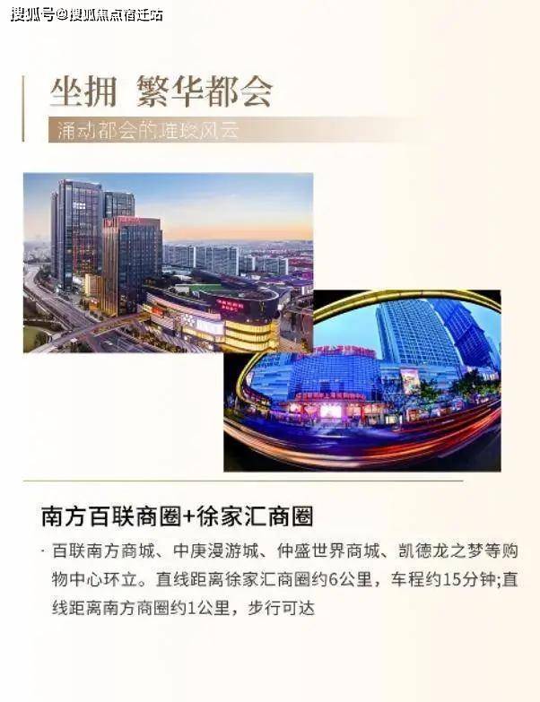 百联南方商城、中庚漫游城、仲盛世界商城、凯德龙之梦等购物中心环立。直线距离徐家汇商圈约6公里,车程约15分钟;直线距离南方商圈约1公里,步行可达