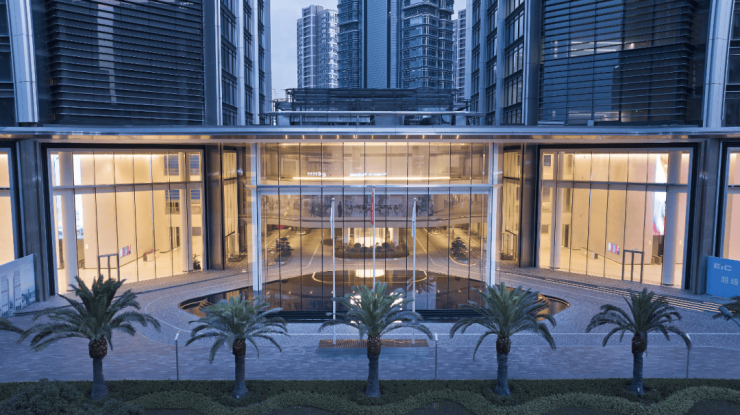 以领先国际的首层18米挑高宏大剧院式大堂为例,仅单块玻璃就有11米高、2.4米宽,为高效、高质呈现,光调用起吊机就有4、5台,效率提升好几倍,呈现出比苹果旗舰店还要震撼的效果。