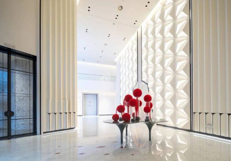 挑高11米的大堂,墙面几何结构像极了兰博基尼的散热鳍。