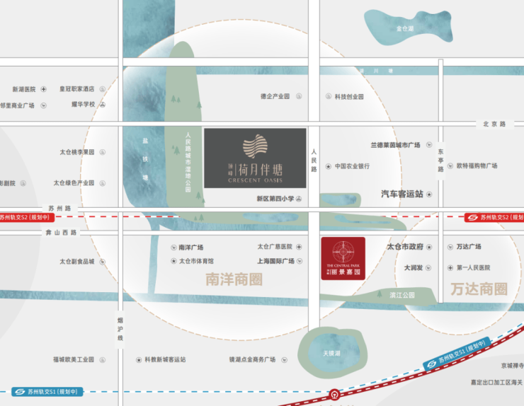 项目位于太仓市人民北路与北京西路交汇处,项目左侧人民路、右侧盐铁塘公园,左边是繁华、右边是生态自然。