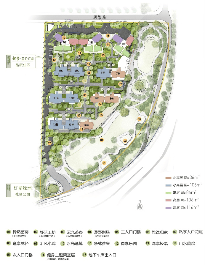 星汇灯湖景观设计提炼自在惬意的城市人文精神内核,以定制细节的酒店美学回应90、95后品质生活的需求,打造“两轴+三院+十大园居专属生活场景”,塑造自在隐逸生活秘境。同时链接内外双园,6+10场地触点联动,未来场景所见可得。