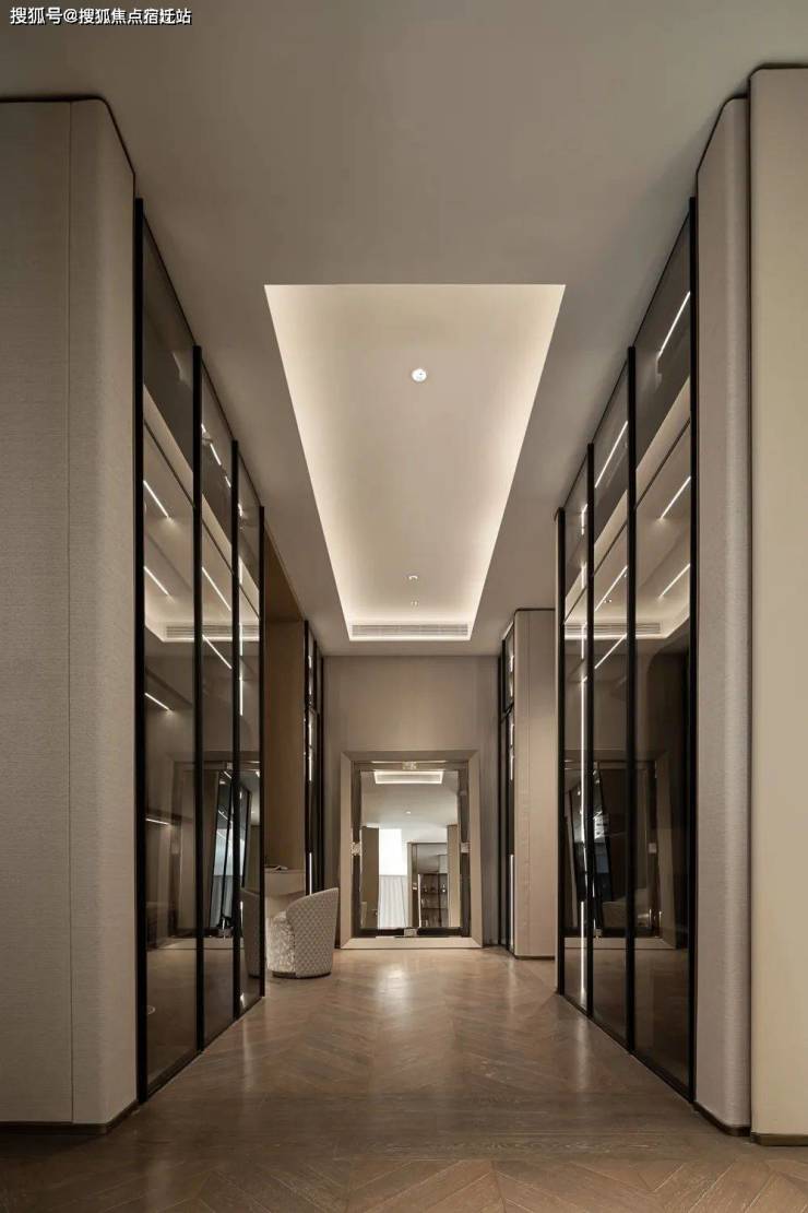 走道端处香槟色金属雕塑,形类城市高楼,又若恋人彼此依偎;全采光套房拥揽白日上海黄浦的忙碌、繁华,也收藏夜晚灯火阑珊的宁静、美好。