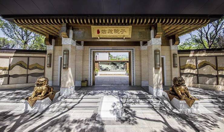 大门两侧的入口照壁由10米长屏风组成,以王希孟《千里江山图》来演化山峦轮廓,从此,千里江山在侧,豪气在胸。