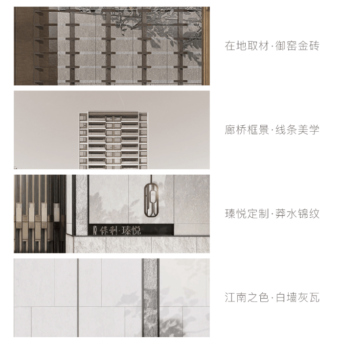 保利姑苏瑧悦取法苏州园林的廊桥框景线条美学,演绎为框体线条造型和简洁舒展的立面肌理。在地取材,运用质朴拙雅的御窑金砖,提取粉墙黛瓦的江南之色,定制兼具东方韵味和现代质感的蟒水纹,呈现与众不同的东方韵律和建筑表情,让家成为城市中一眼的确定。