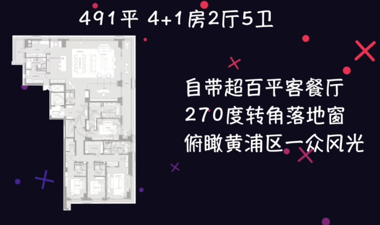 主力建面约491平户型,自带超百平的巨幅尺度客餐厅,搭配270度转角落地窗,可以俯瞰黄浦区一众风光。