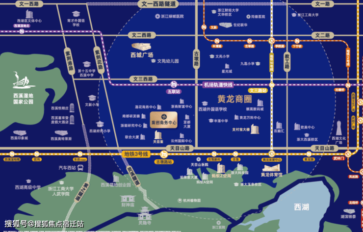 从紫创商务中心走出,沿古墩路往南不到300m,即可抵达地铁3号线古墩路B口,由此出发,3站黄龙体育中心、6站武林广场、7站直抵湖滨龙翔桥,杭州市心繁华生活唾手可得。再往远看,项目距地铁2号线丰潭路直线约1.8km,距机场快线五联站(在建)直线不过700m+,前者丰富了项目出行选择,后者则便捷直达火车东站、萧山国际机场,国内、国际商务出差能有稳定交通保障。