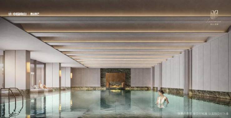 约1500m²恒温泳池会所及落差达约10米的水幕下沉式园林的打造,在奢石、臻材等元素的空间应用中, 让显贵世家的社交场景,相映于粼粼碧波的柔光之中,于方寸之间游离世外。