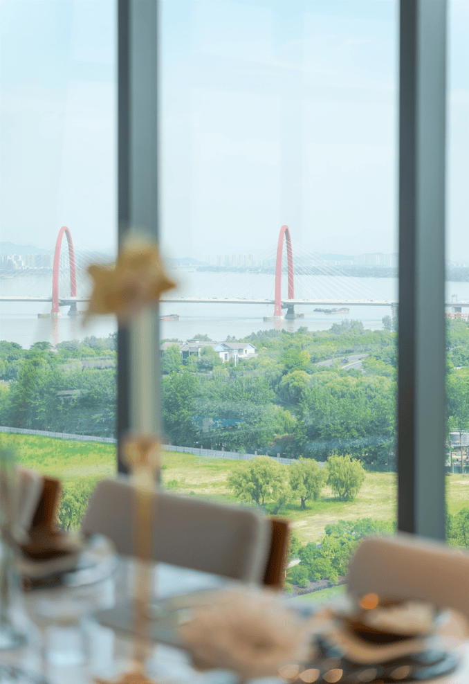 于是,站在之江门样板房的落地窗前,开阔的江景一览无余。整个窗景像是一幅超级巨幕,上演着钱塘江上的潮起潮落,日月更替。横扫整个瞰江视角,一边是绵延的西湖群山,另一边是之江大桥的车水马龙,对面就是“国际滨”林立的高楼,山水风姿与城市繁华尽收眼底