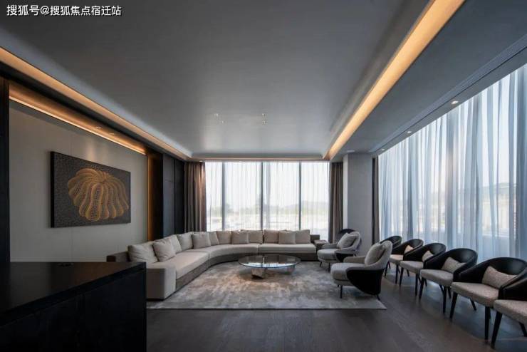 客厅开间约11.4米,超85㎡!搭配首层约4米的层高+大落地窗,颇有“独栋大厅”的气场。华家池908㎡的“华墅”,双厅加起来也就85㎡左右……