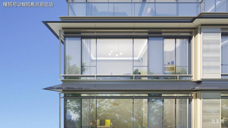 汲取宋式坡顶与挑檐,遵循现代高端镜面立面趋势,臻选高级铝板、石材勾勒建筑轮廓,搭配三玻两腔降噪隔⾳玻璃,以超高窗墙比让室内与自然无界沟通,丰盈宋韵美学。