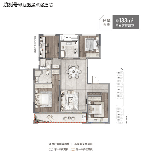 另外一款建面约133㎡改善洋房户型,得房率约84%(不含赠送)。