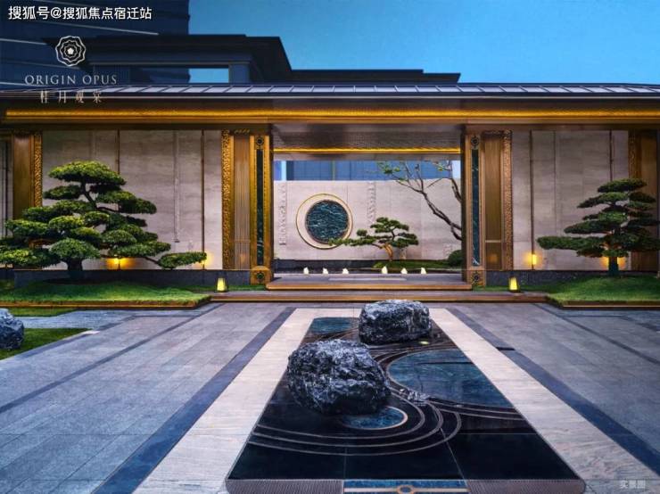 入户两侧水景清泉涌动,婉转迂回,一座精致的宋风美学馆展示在眼前。透过门框衬映出满月景墙,甄选名贵奢石,在虚实掩映间延续着东方诗意山水的写意画卷。