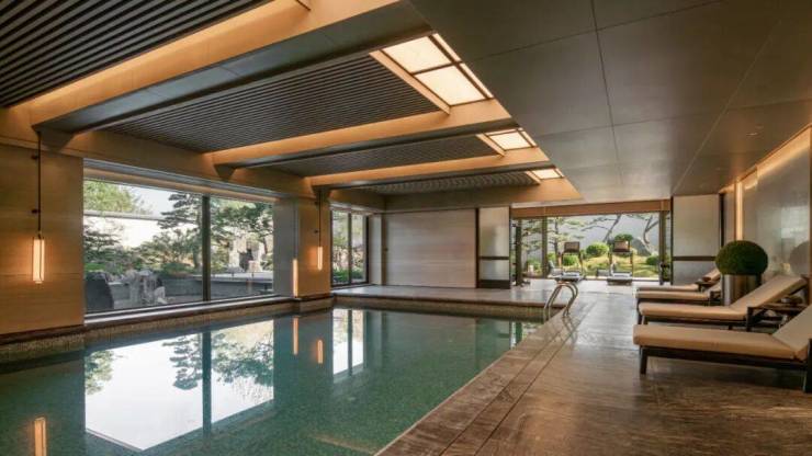 从室内泳池朝外看去,园内水体聚中有分,动态的水和静态的山石带来独特的观感,一幅幅自然画作成为大面幅落地玻璃前“隐藏” 的背景。