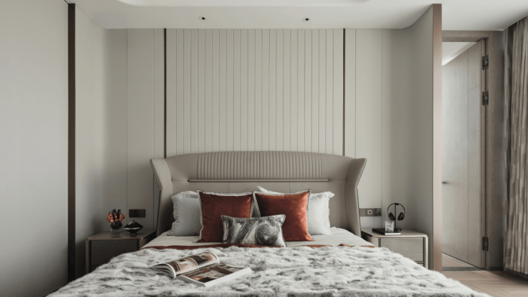 白色的岩板与桃木背景墙让人联想到枫丹白露宫殿的动人秋天。打造生活中的高级感不需要繁琐复杂的浮夸装饰,而是要在空间之内做减法。深色与浅色的交叠呼应之间,让曲线与直线共同构建空间的秩序,匹配房间整体弧形外观,打造内部张弛有度、流畅自如的线条感。
