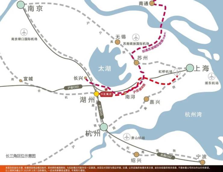 城市主轴望湖大道、G50沪渝高速、如通苏湖城际铁路(南浔至长兴段在建中);
